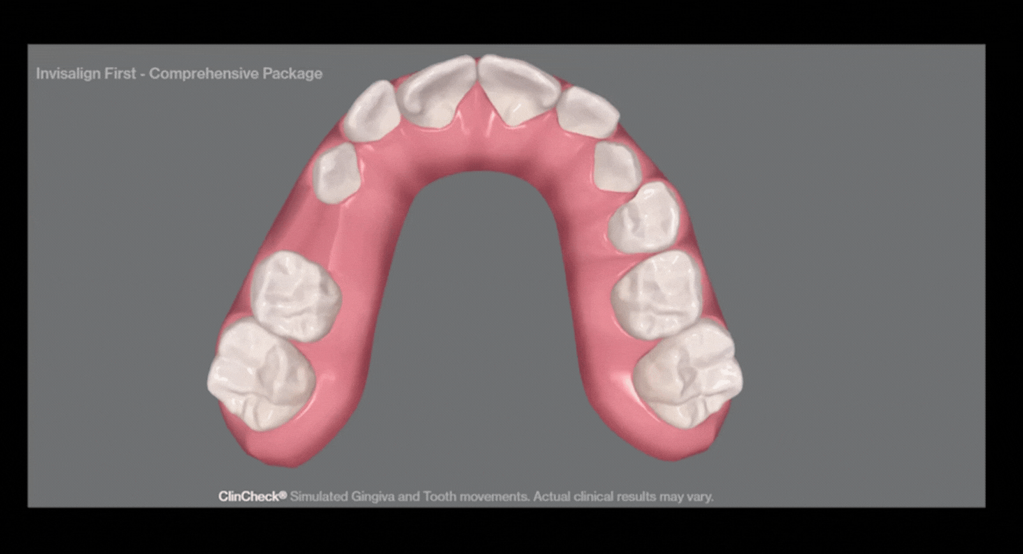 Az Invisalign First átlátszó sínsorozat (aligner), ami lehetővé teszi a maradó fogak előtöréséhez szükséges helyigény biztosítását. A kezelést késői váltófogazatban érdemes elkezdeni, ekkor tejfogak nagy része már kiesett, de néhány közülük még a szájban van.
